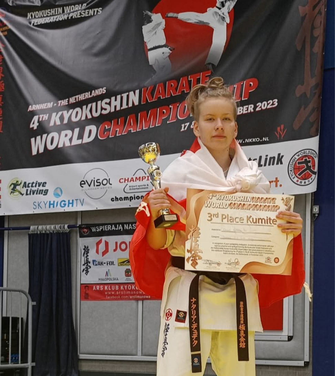 Szanowni Państwo, nazywam się Natalia Dudek, mam 18 lat i od dziecka trenuję sporty walki. Na swoim koncie posiadam 3 krotny tytuł Mistrzyni Świata Kyokushin Karate, oraz 10 krotne Mistrzostwo Europy. W tym roku wywalczyłam również tytuł Mistrzyni Polski w Muaythai oraz reprezentowałam Polskę na Mistrzostwach Świata w tej dyscyplinie.